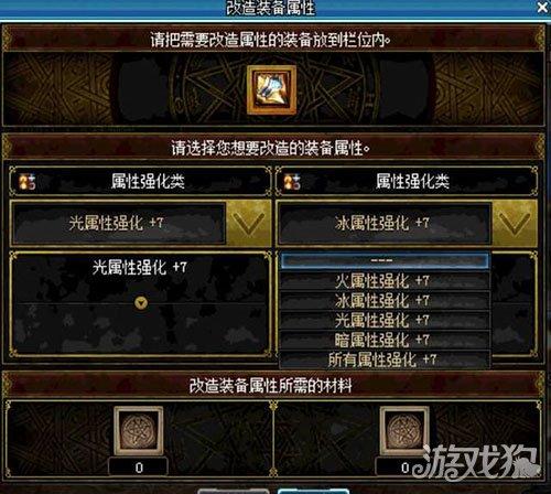 最重要的就是装备的升级、打造了, 在副本外有一个斗气改造机,第一项是改造装备属性, 就像上图一样,本来装备属性是光属强+7 ,我们可以通过所需材料改成右边的属性, 可以任意选属性哦!只不过对应所需的材料不一样,不过貌似这样的传说装备属性真的有些垃圾啊,不急,还有,看下面.....