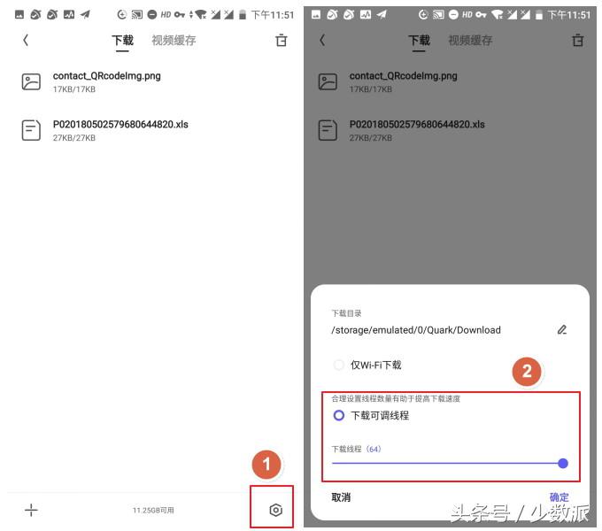 使用夸克下载网盘资源有着神奇的效果,官方号称支持多线程加速、多任务并行的特性,在采用默认的下载选项时,下载速度大约在 300KB-600KB/S 的区间内。如果要实现提速下载的话,按照下面的图示调整下载线程: