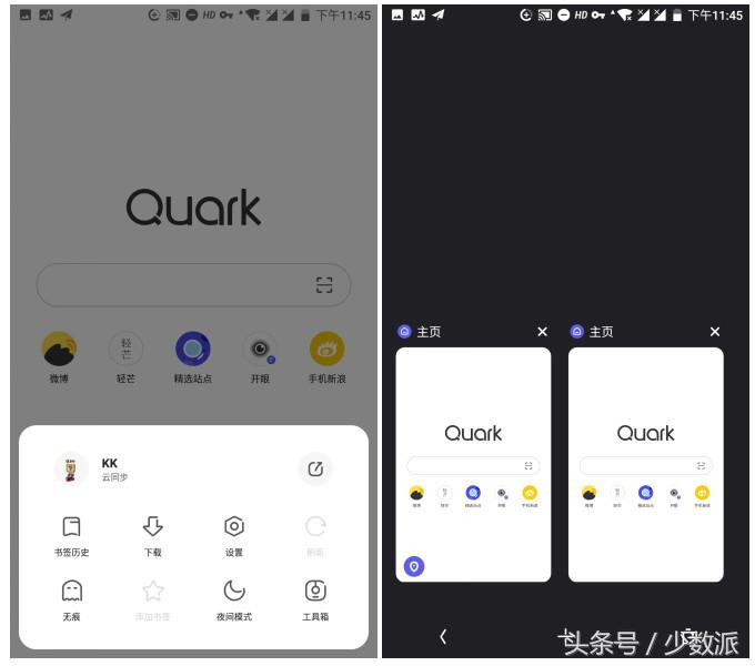 首先登场的是被不少人「吐槽」的 夸克浏览器,网上有朋友抱怨夸克经过近两年(2016 年 10 月发布了第一版)迭代更新,安装包体积是越来越大,甚至有反映说有些网站不能在夸克上打开(其他浏览器却能正常打开)。在我的使用体验中,我还没有碰到这些问题,夸克横空出现为当年浏览器产品界带来了一阵清新的风格。