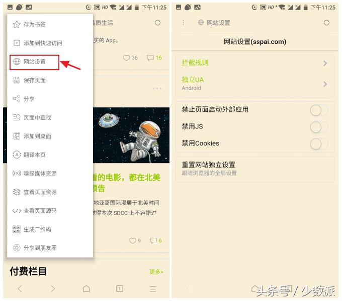 X 浏览器支持对每个网站设置单独的浏览策略,比如打开知乎网站后,点击浏览器界面左上角的按钮,选择「网站设置」,可自定义广告拦截规则、切换独立 UA、禁止页面启动外部应用、禁用 JS、禁用 Cookies,将 UA 设置为 ipad 或者桌面后,可以突破知乎查看全部回答时跳转至 Apps 下载页面的问题。同理,运用不同的设置策略,可以突破 bilibili 在手机浏览器六分钟视频时长的限制。