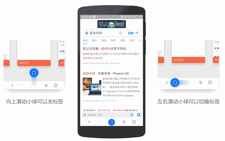 星尘浏览器拥有一个标志性的小球设计,用户通过底栏的主页键可快速完成常用操作,小球支持左右滑动切换标签页,向上滑动关闭当前页面。