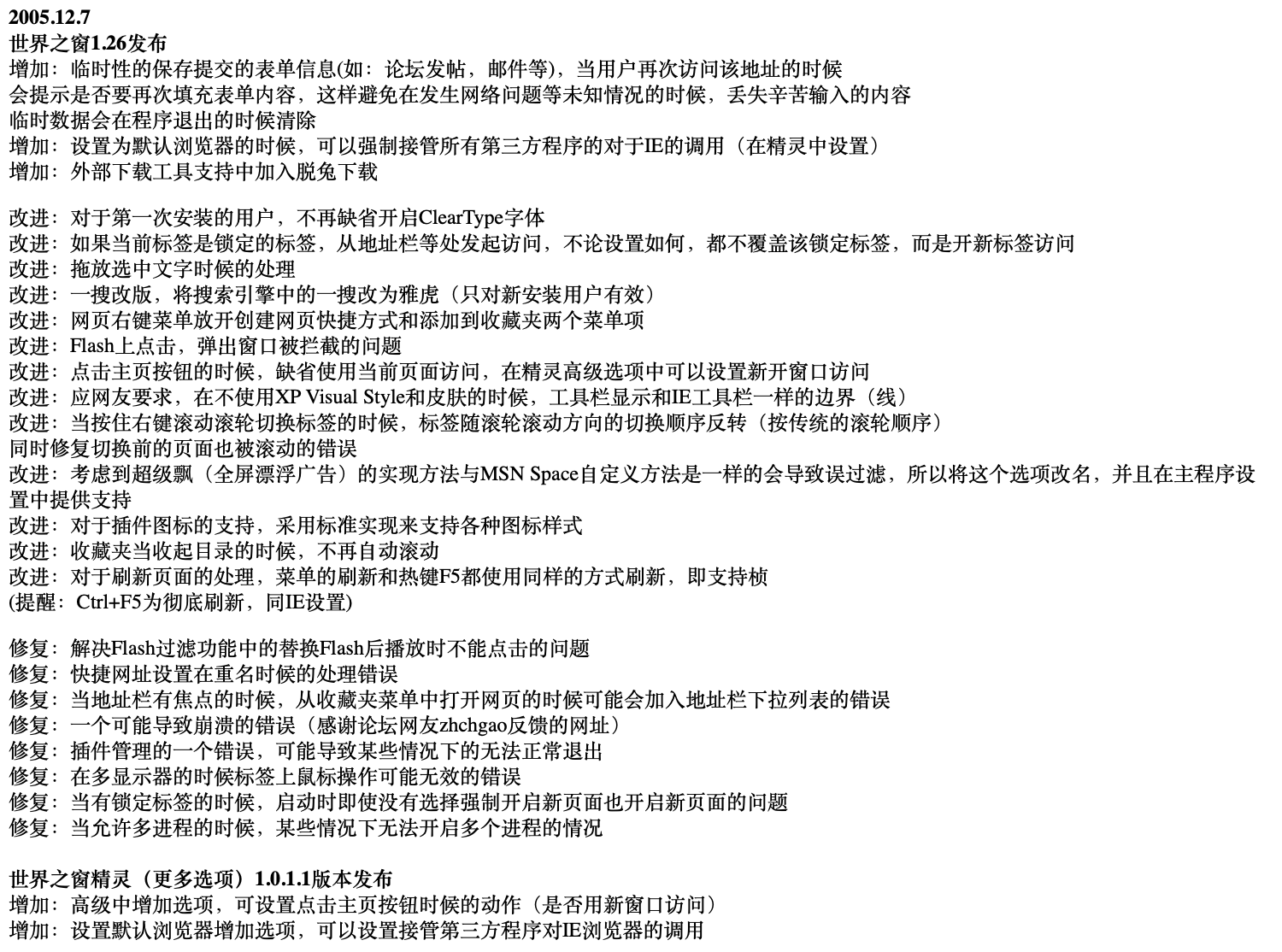 事实上,他们的确做到了,2004年3月3日,世界之窗的第一个beta版发布,1.0版本的更新,基本都能维持在一到两周左右,这样用户反馈的基础功能,可以做到相当迅速地响应。 一到两周的功能迭代,而且一点都不“水”,这可以与火狐和Chrome的更新速度相媲美。