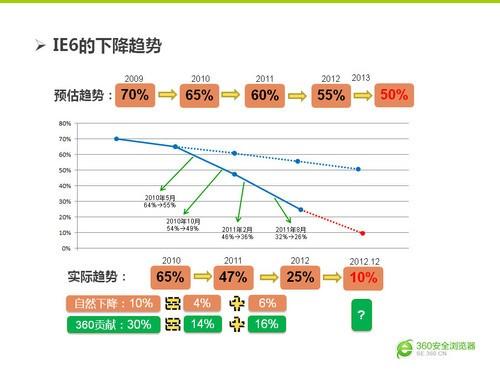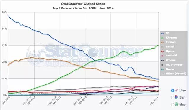 而随着Chrome出世,凭借着快速优化和对W3C的完美支持开始抢夺用户,微软的处境开始变得尴尬。同时,不勤奋更新的恶果终于显现了出来,反应慢、CSS支持差,IE遭受了前所未有的反噬。并于2012年正式被Chrome超越。