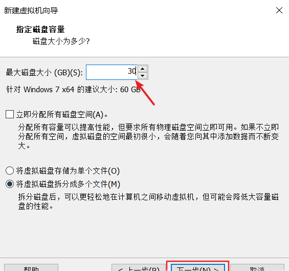 9.要分配磁盘,建议win7 32位系统大于20G,而win7 64位系统应大于30G。当然,它可以在后期增加,但不能减少,因此建议不要分配太多,我这里是64位30G。