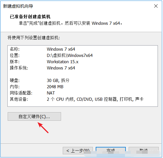 10.默认情况下,单击“下一步”。单击自定义硬件并进行检查。