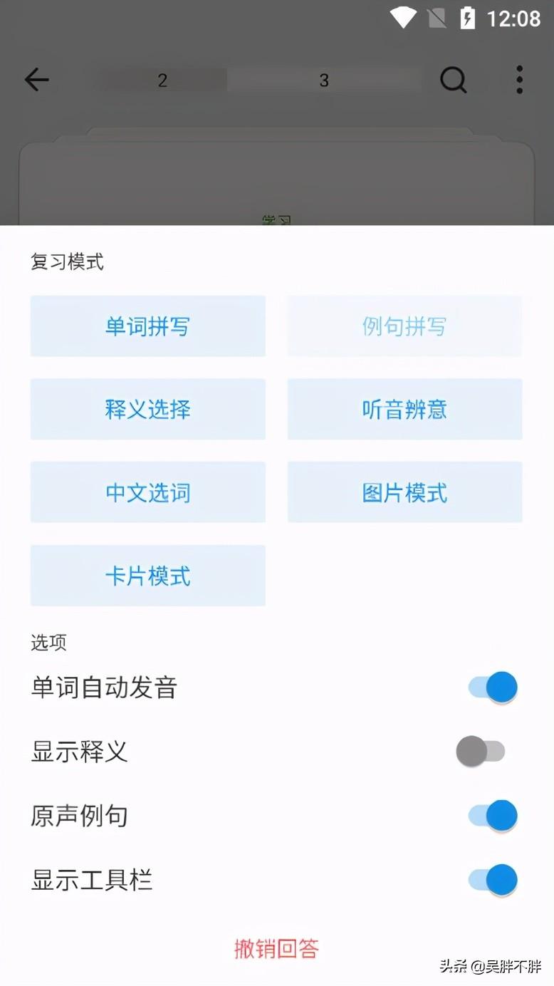 3.复习可选择多种模式,【单词拼写】【例句拼写】【释义选择】【听音辩意】【中文选词】【图片模式】【卡片模式】