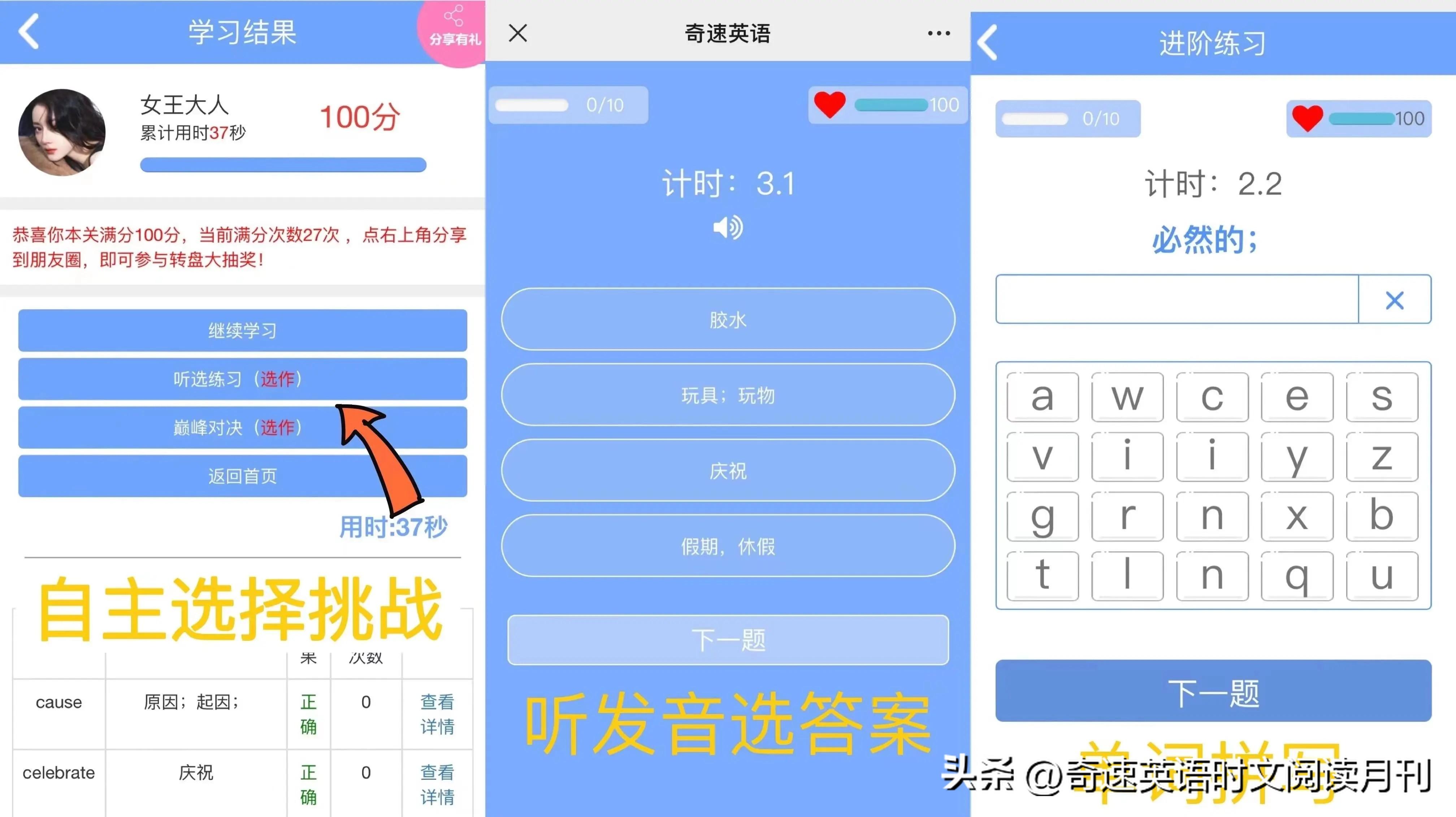 2.学习时,先看单词选词义,连续答对3词则单词过关