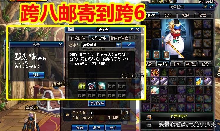 “DNF之小狐狸君爱谈游戏电竞”第四百二十一期《DNF10.6卡邮件BUG:称号附魔增幅券,跨区寄10E,金币比例崩盘》,随着游戏职业的增多,多角色已经不能满足顽疾阿勒,尤其是搬砖玩家,基本上都是多号党。小狐狸也是在跨6河北一、华北二;跨7的华北4都在玩的。玩一个小区和一个大区。不过在最新的一次寄邮件的时候,将华北四(跨8)的道具,发送到了东北二区(跨6)。其中有金币、附魔宝珠、附魔卡……后来去群里一看,才发现是最近史派克修复邮件系统,留下的后遗症。