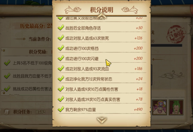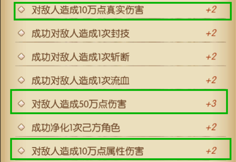 不要速战速决,尽量拉满20回合,因为我们要尽可能多刷各种积分任务的次数,刷满20回合拿到的积分,远比速战速决要高得多。再有这里有的效果不触发,比如斩断,那斩断的积分也就拿不到。所以我们要去刷那些能触发的任务(流血、致死这类)。