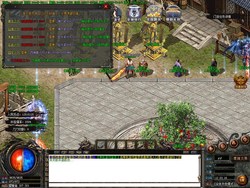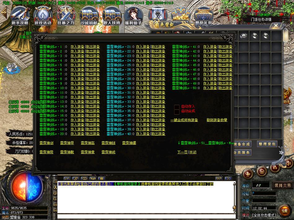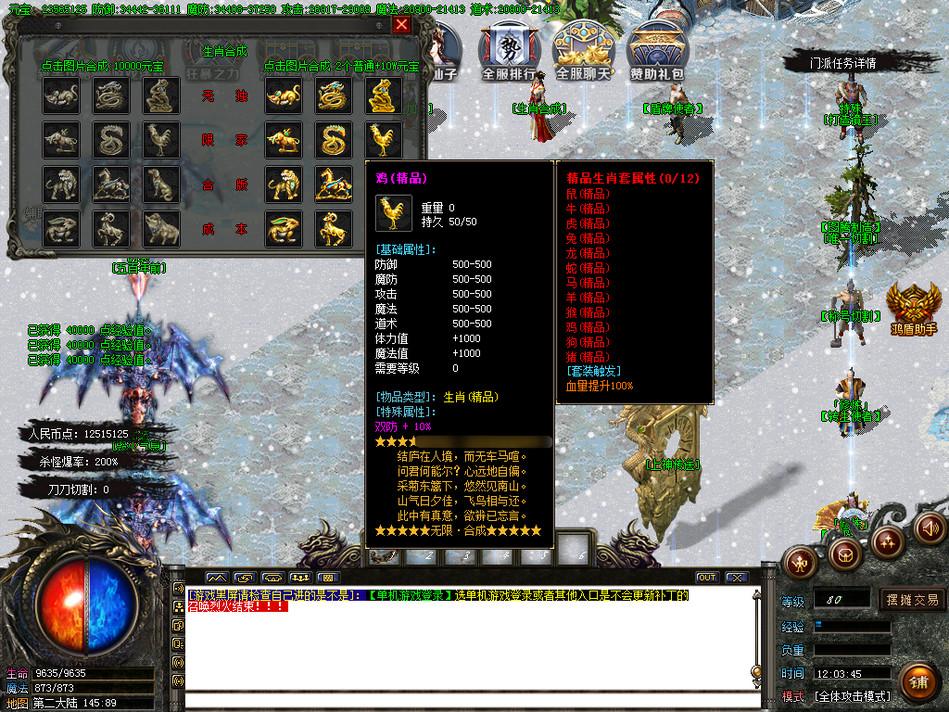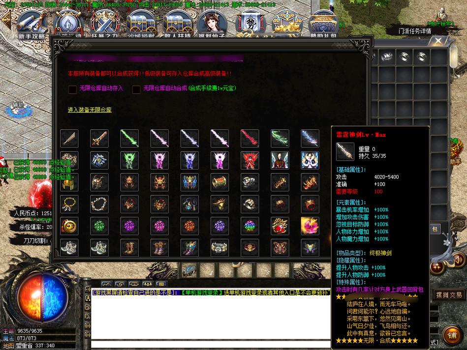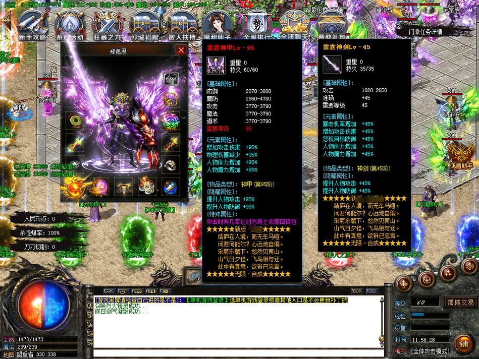 【功能功能】:3个大陆内容,无限合成,最高合成雷霆+100,全自动合成,自动存仓库,带狂暴沙捐,通天塔,BOSS之魂,酷炫大光柱,切割装备,四圣之力,强化加星,生肖合成,血牛元素,神力系统,可以玩到爽的二合一版本