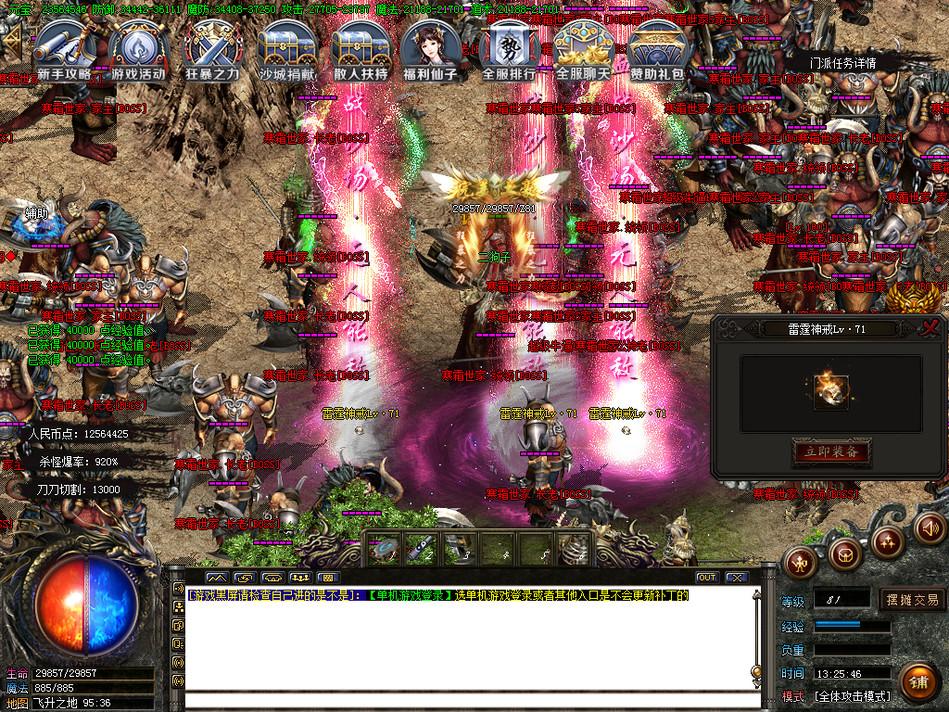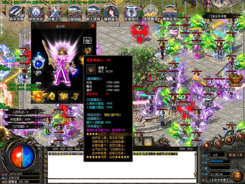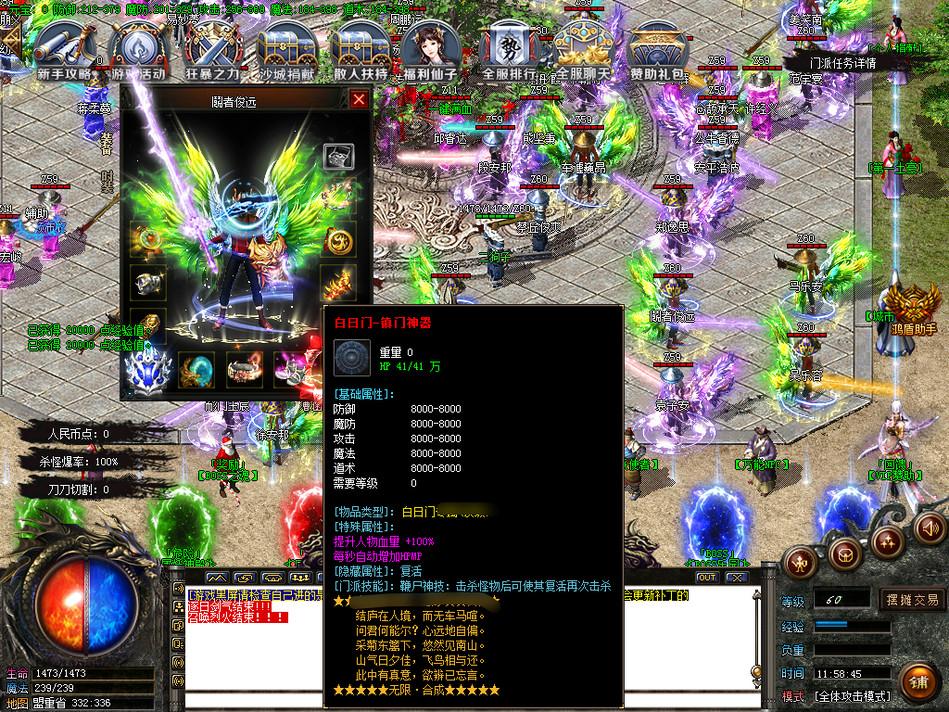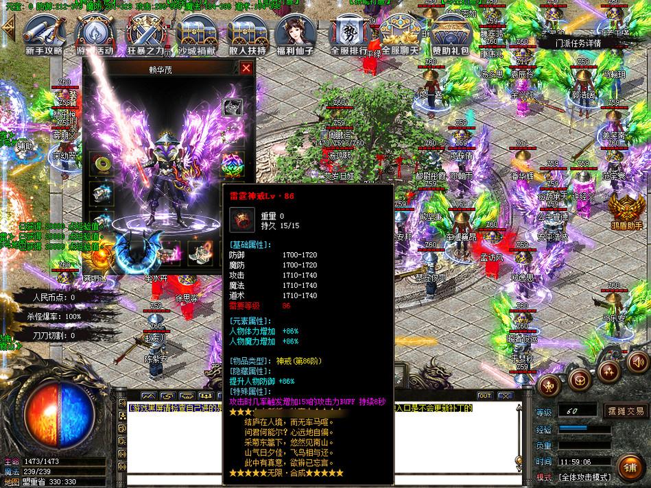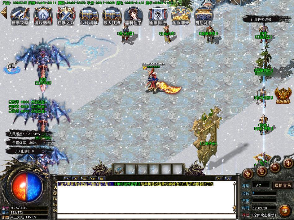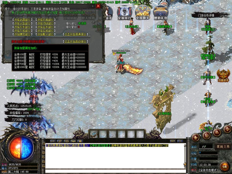 【功能功能】:3个大陆内容,无限合成,最高合成雷霆+100,全自动合成,自动存仓库,带狂暴沙捐,通天塔,BOSS之魂,酷炫大光柱,切割装备,四圣之力,强化加星,生肖合成,血牛元素,神力系统,可以玩到爽的二合一版本