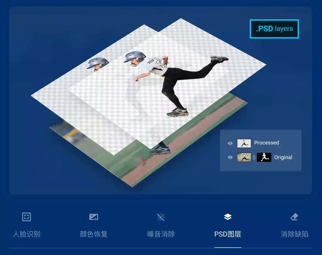 与其它在线抠图工具不同的是,这个工具除了能输出图片,还能输出 Psd 分层文件,便于拉入软件中编辑 ,也能进行一些简单的图片处理,比如人像美化、图片祛噪等。