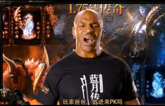 听到泰森用扭曲的表情加上蹩脚的中文激情昂扬地喊出“恭迎玩家爸爸,敢PK吗?”,我整个人都解体了,估计翻译告诉他这句话的意思其实是“弱鸡玩家,爸爸揍你”。遗憾的是这次代言泰森没有秀出他的肌肉群,而是穿着一身酱油工作服抽射嘴炮,虽然不协调感爆棚,但确实吸引了大量眼球和口水。