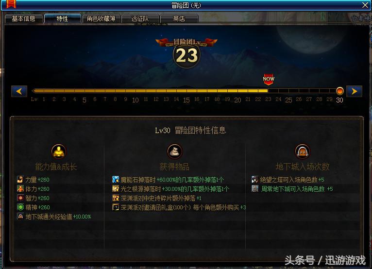 冒险团在DNF中也是提升极大的部分,满级冒险团拥有260点四维提升,而且还有每日材料掉落率增加和周常副本入场角色数增加等属性。冒险团等级的提升没有太多捷径可走,只有老老实实多练一些角色,小号在86升到90级的阶段时,冒险团经验是涨幅最快的时候。