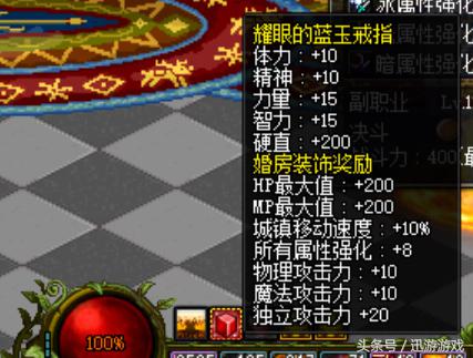 当然结婚只是第一步,结婚之后还需要用心意点布置婚房和升级戒指等级,上图展示的即是满级结婚属性,对现在的版本来说8点属强是非常大的提升。