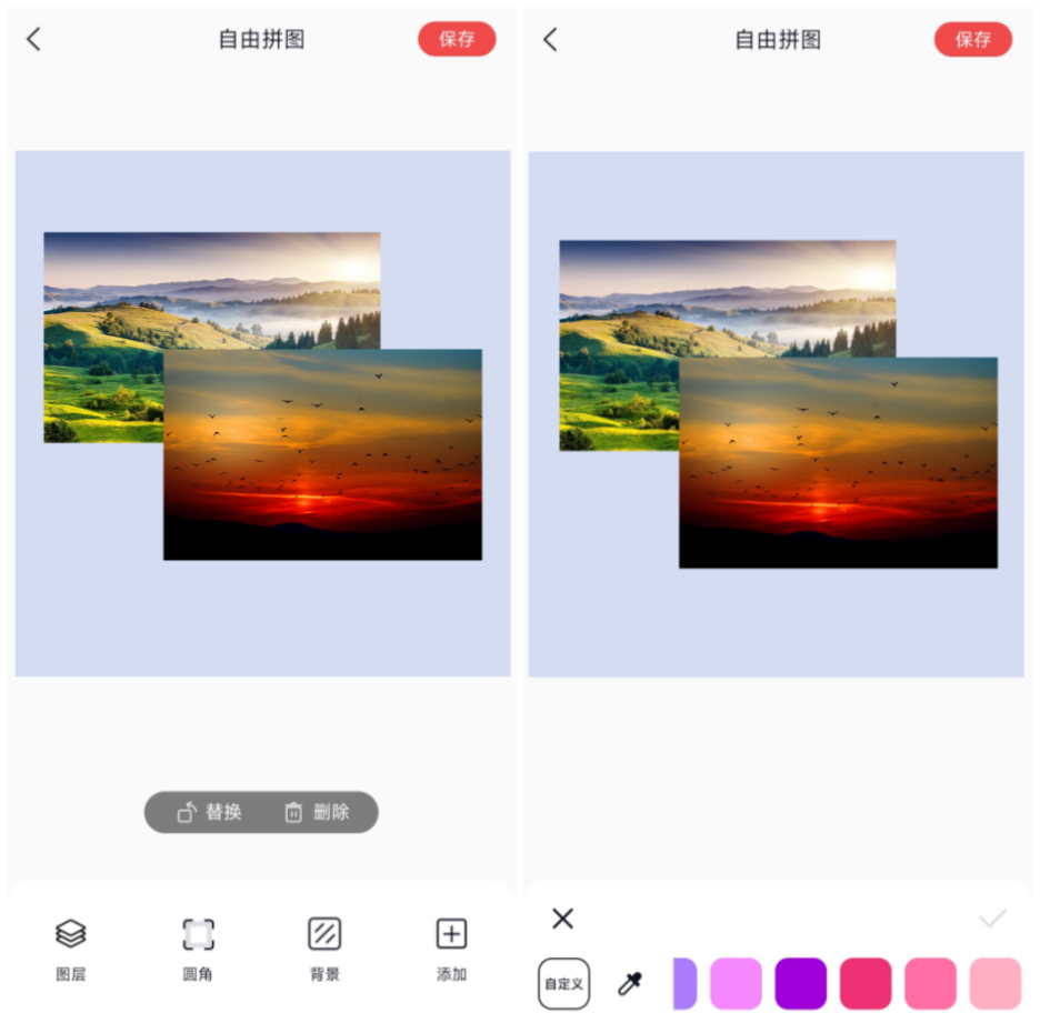 以自由拼图为例,可以根据自己的喜好任意布局,选择背景颜色,直接添加已有画布或者上传自定义图片都可以!