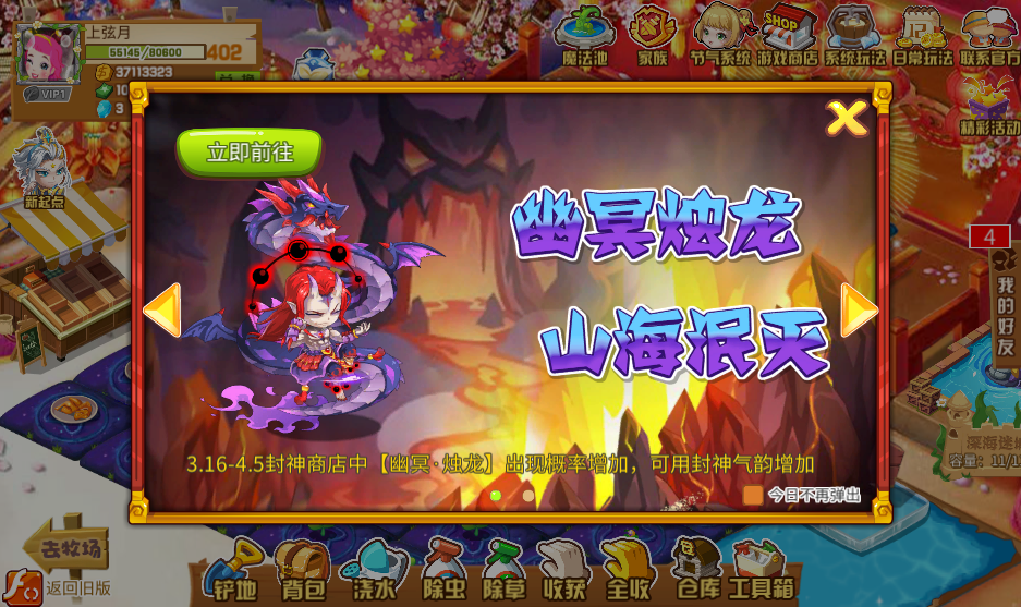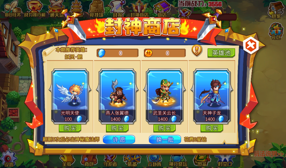 不过休闲游戏的生存空间越来越小了,即使是《QQ农场》,最近几年也不得不提升“紧迫感”。比如,现在登录游戏,会在开屏页面弹出“封神商店”的促销信息。这是一个融合“塔防”“养成”等要素的新玩法,玩家需要培养“燕人张翼德”“天神子龙”“幽冥·烛龙”等封神英雄,从袭击的野怪手中保卫田地。