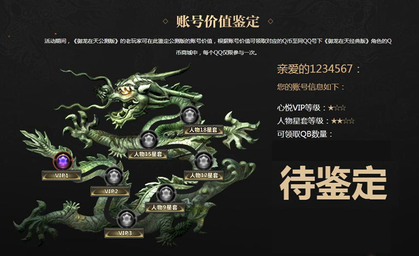 账号鉴定——你的老账号值多少钱?快来鉴定一下,置换为御龙Q币,可购买Q币商城的任何物品,无本万利玩转《御龙在天经典版》!