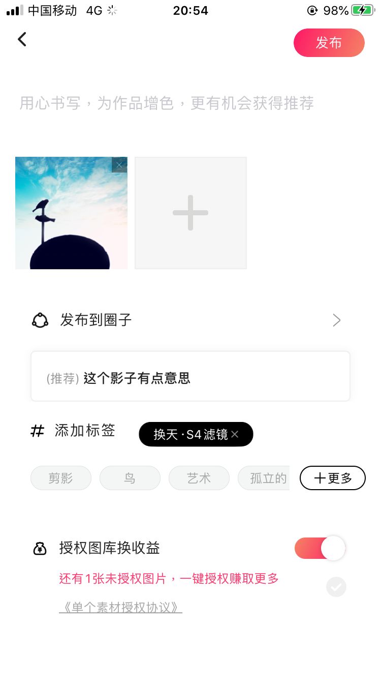 可以直接发布到相关的圈子,让更多的看到,如果图片卖出去还能有收益