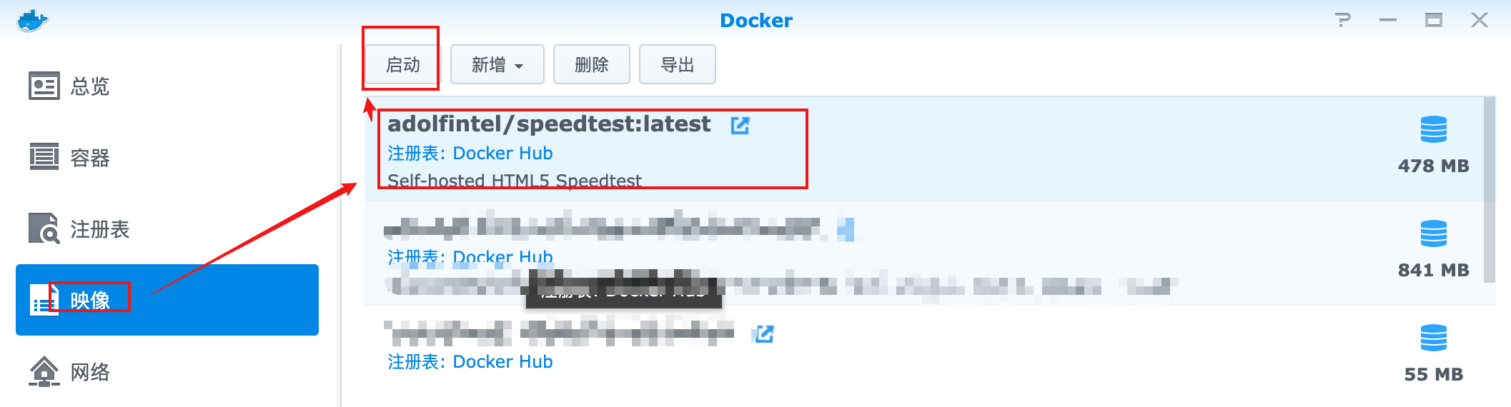 点击映像,找到拉取成功的镜像,选中,点击启动。