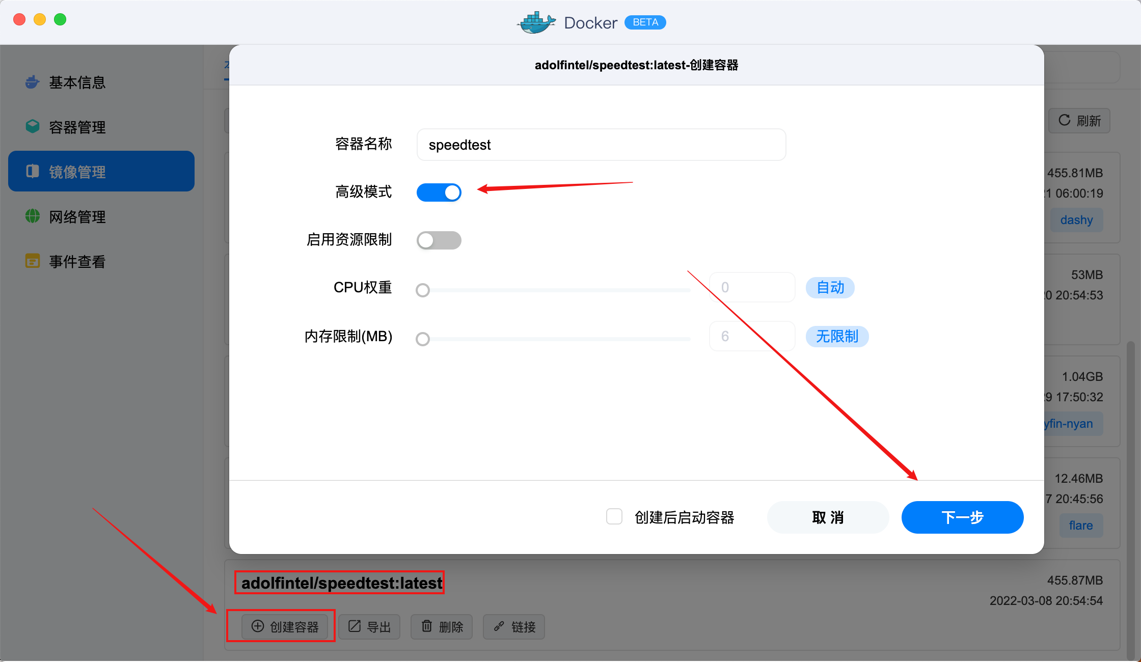 找到拉取回来的adolfintel/speedtest,点击创建容器,打开高级模式,下一步。