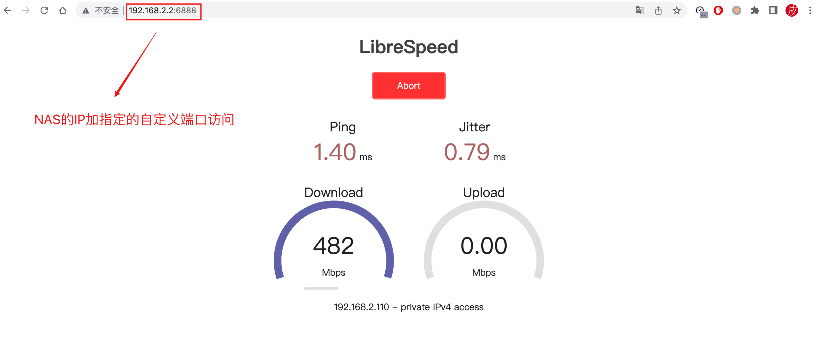 NAS的IP加前面指定的自定义端口,成功进入测速后台。