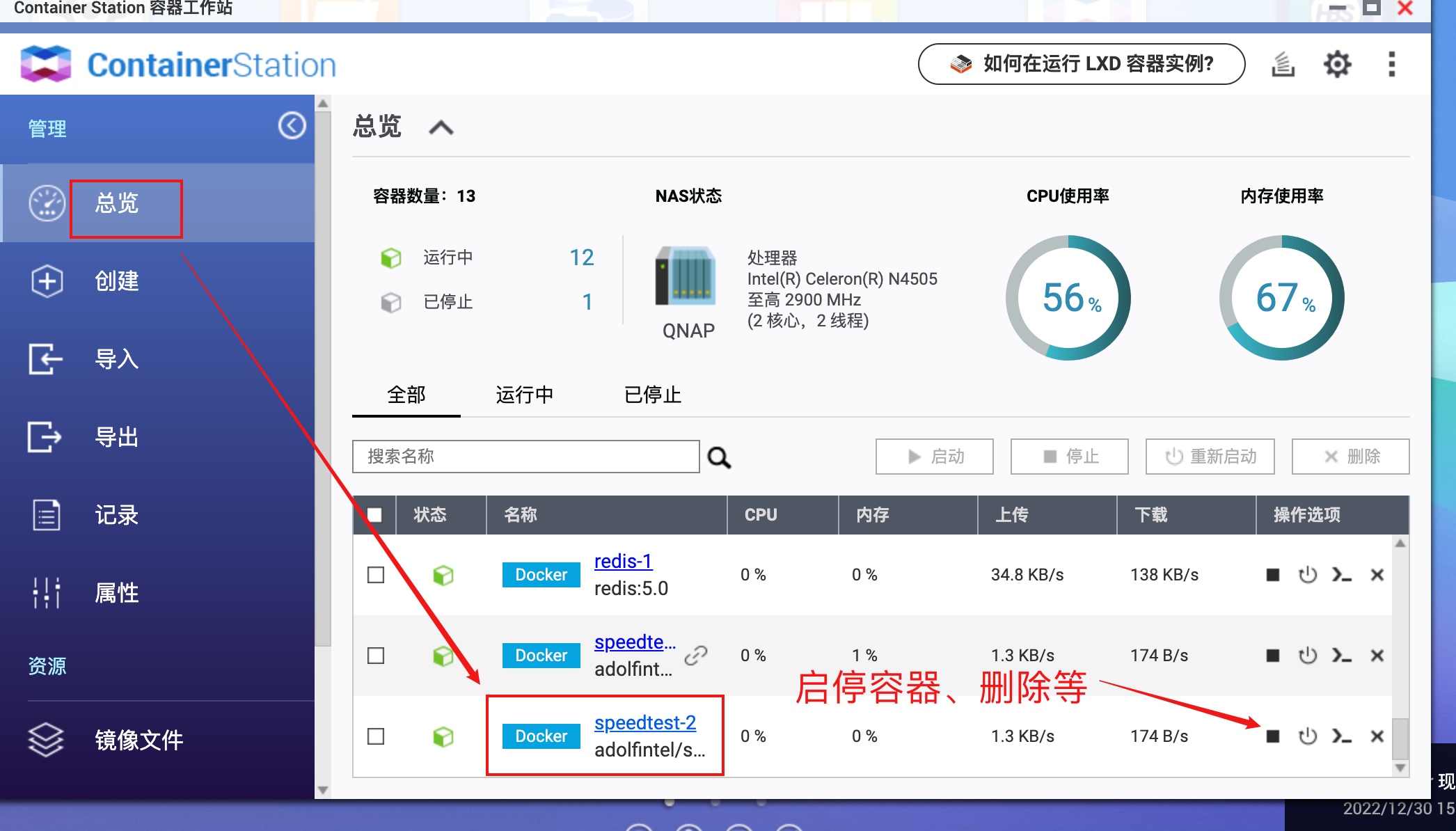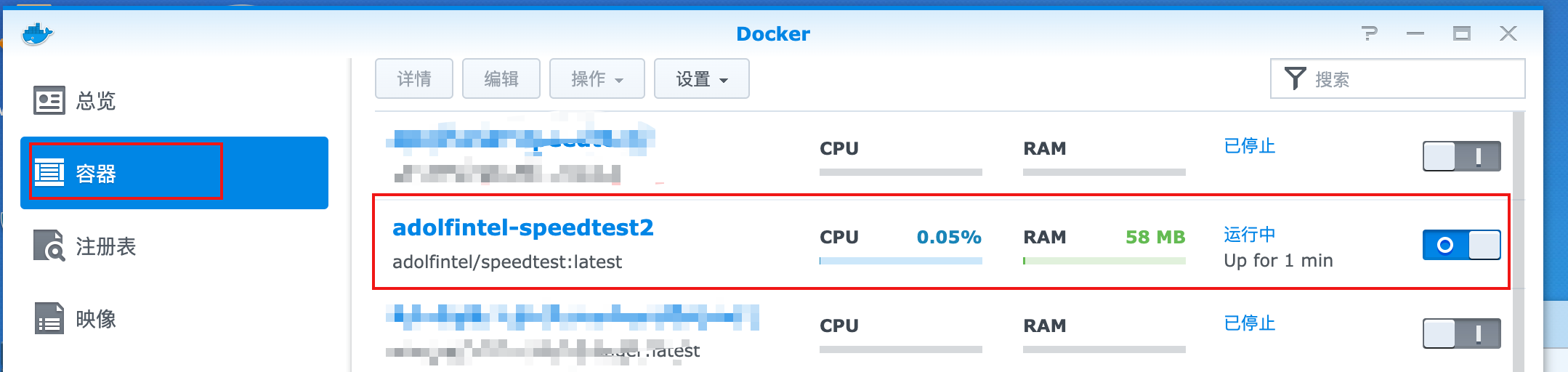 在总览处,即可看到创建成功的speedtest容器,后面按钮可进行停止、启动、删除等操作。