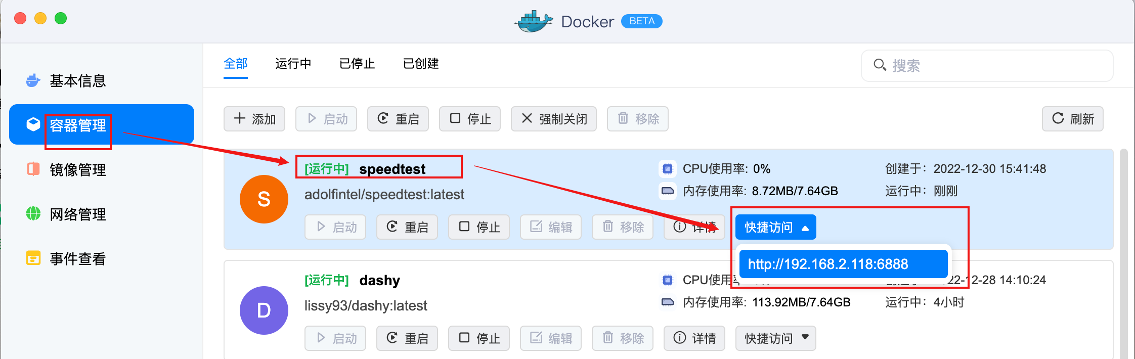 在容器管理处,可看到部署好的容器,可进行启动、重启等操作,点击快捷访问,即可跳转到测速后台。
