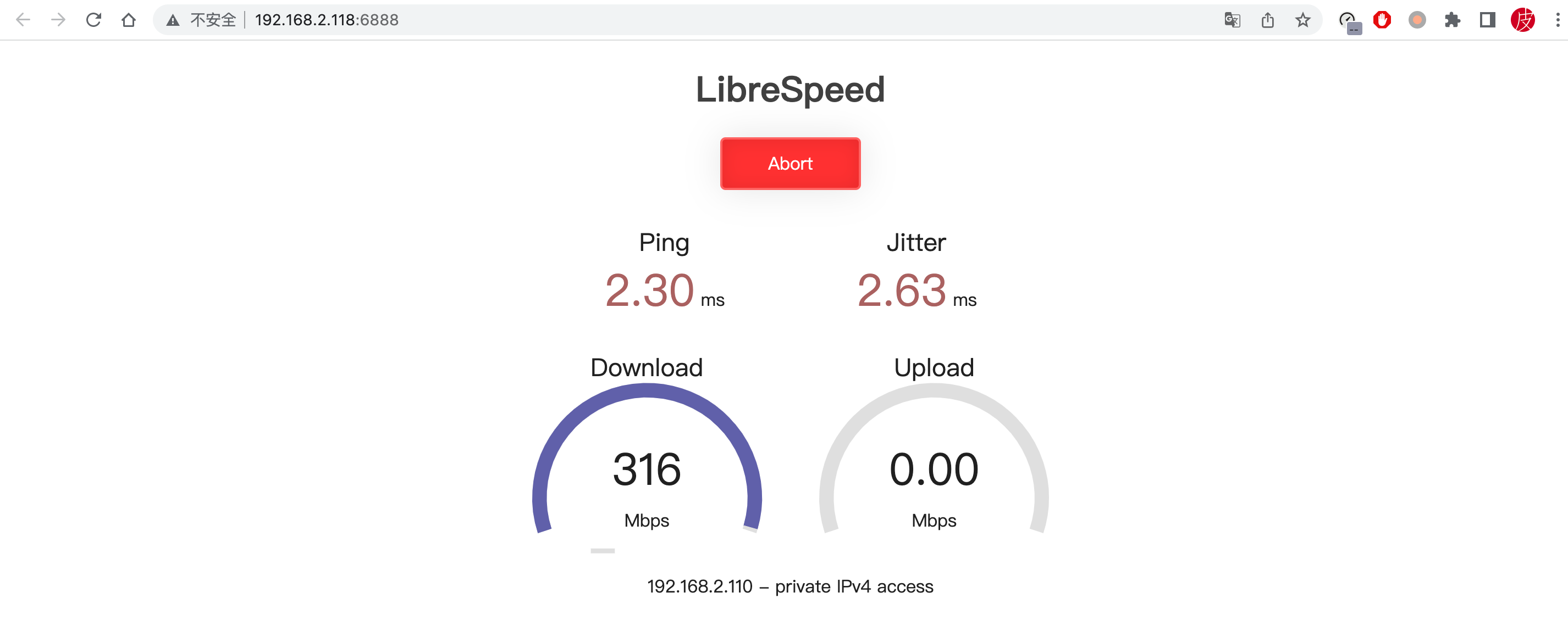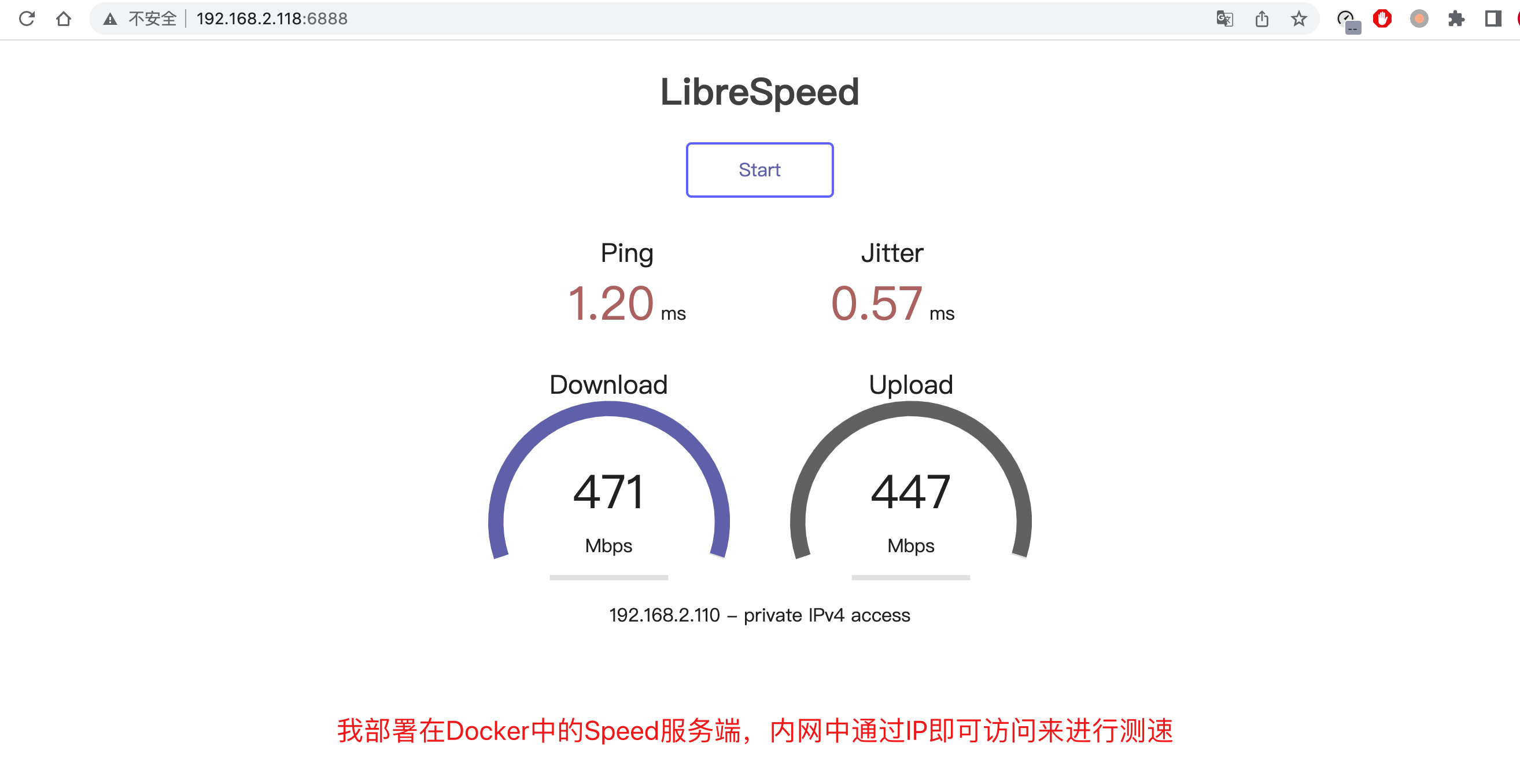 使用很简单,如下图,内网NAS中搭建LibreSpeed测速服务端后,通过内网IP加端口即可访问,点击Start即可开始测速。