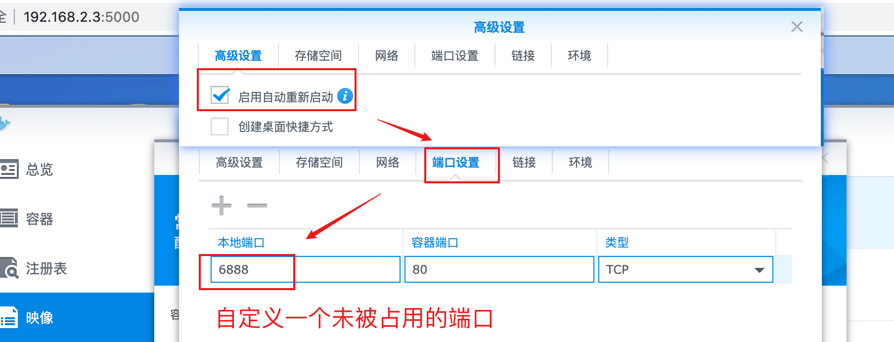 在网络处选择bridge,端口设置处的本地端口指定一个未被占用的端口即可,我指定了6888,高级设置处,勾选启用自动重新启动。