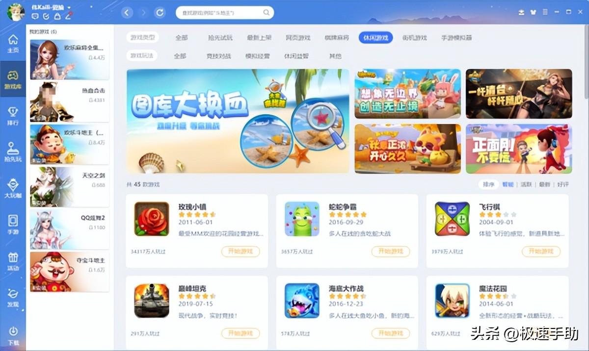 而QQ游戏大厅不仅可以玩像斗地主、中国象棋、欢乐升级、五子棋、够级、跳棋、千变双扣、原子、攉龙、四冲、桥牌等这类的棋牌游戏,也可以玩像蛇蛇争霸、飞行棋、QQ龙珠、玫瑰小镇、海底消消、口袋奇兵、猴子很忙、创想兵团II等休闲游戏。