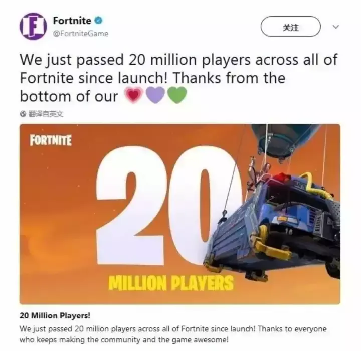 11月7日,《堡垒之夜》的官方在推特上发布消息,其玩家总数已经超过2000万。同样包含“大逃杀”游戏模式的《堡垒之夜》引起多平台免费,以及早期积累下的良好品质口碑,为游戏的火爆打下了良好的基础。这个数据超越了《绝地求生:大逃杀》的1700万份的销量。
