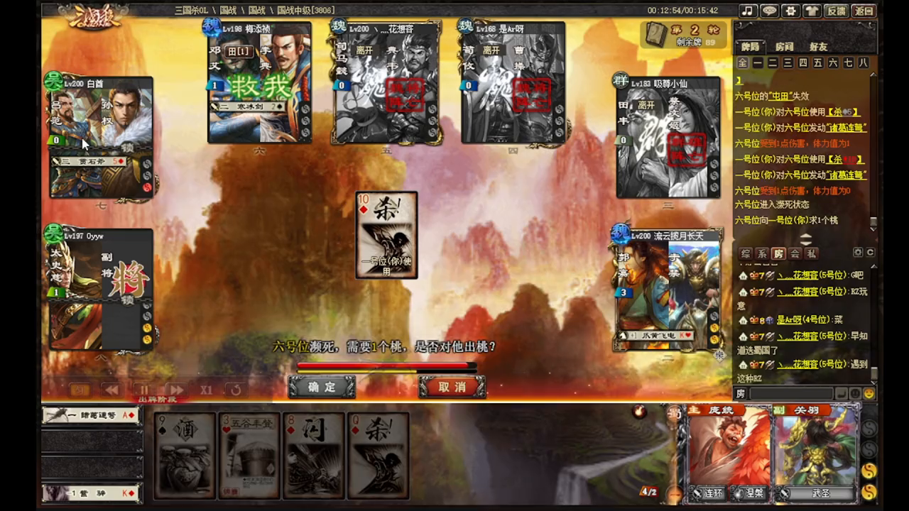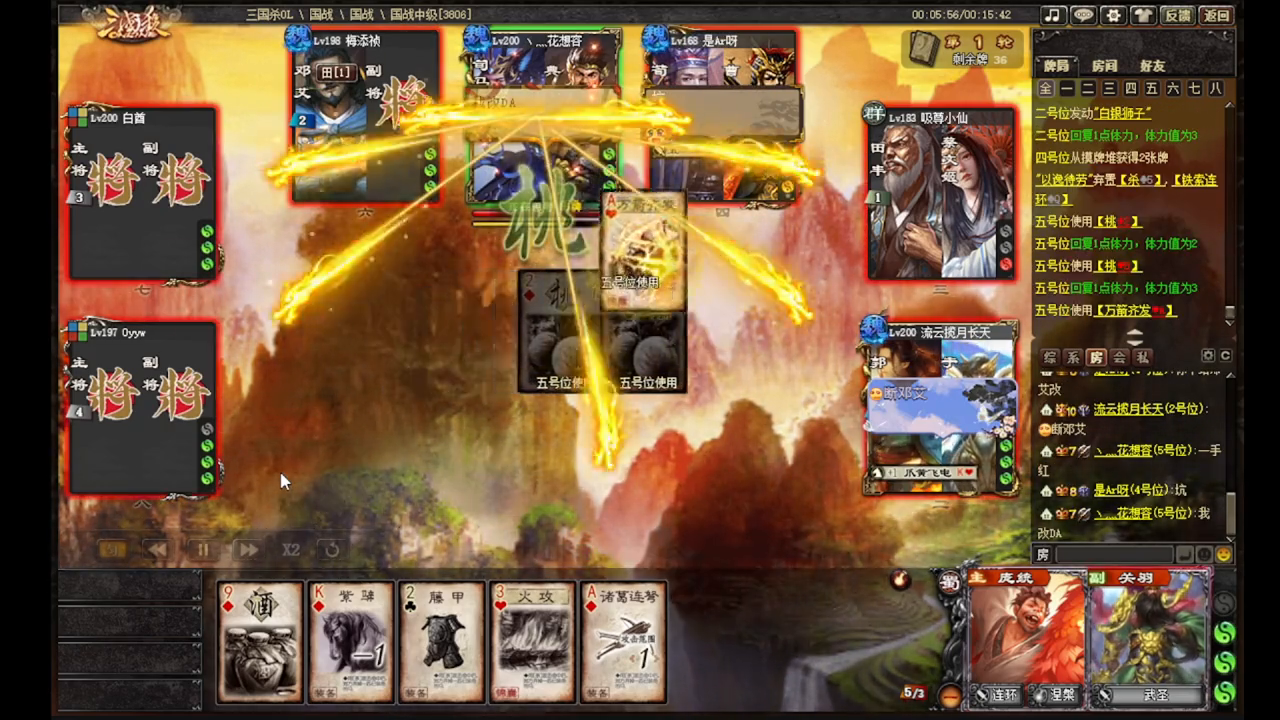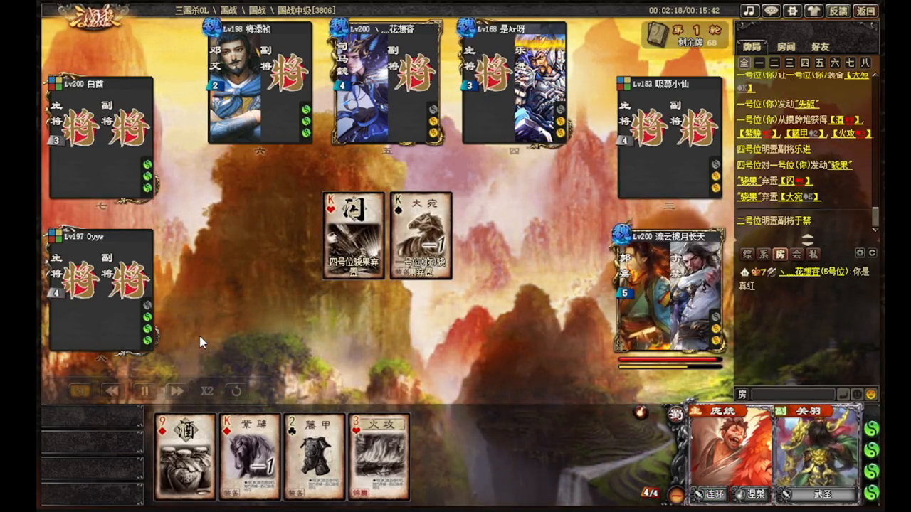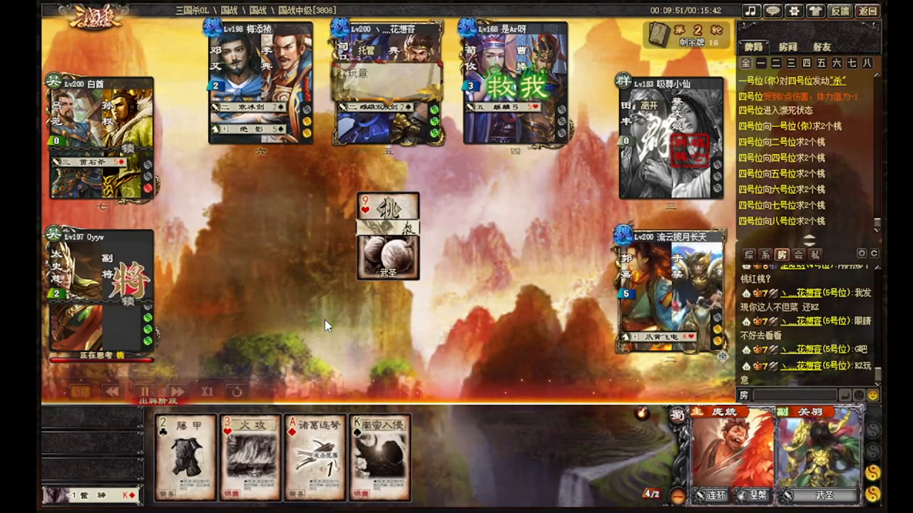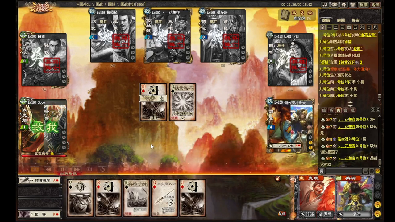 ·第二,如果我选择火攻自己,就无法找到属性杀。我已经过了很多张梅花,却没有找到一张属性杀,如果我有一张属性杀,我为什么不选择九杀孙权呢?将自己和他人全部连接并不能改变最终的结果,因为我最终只有一个桃子。因此,我不可能选择火攻自己。当我需要输出时,我会将梅花全部控制住,以寻找属性杀。然而,我并没有找到任何属性杀,因此我只能先将孙权杀死,然后再杀死刘备,以防止他们是周泰或徐胜,这些人的梅花牌可以被重新组合。关羽可以重新组合梅花牌,因此我需要重新组合梅花牌,以找到鼠云牌。