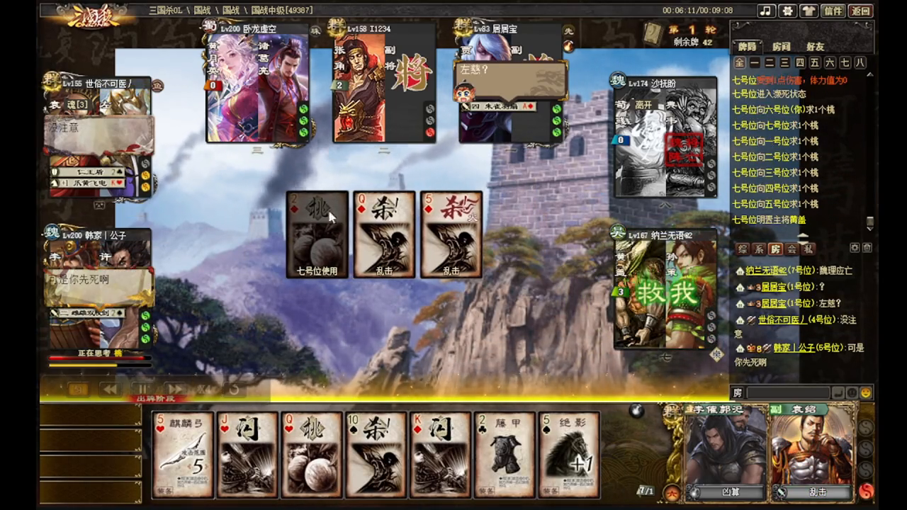 ·因为这是一个新游戏,所以我不能让于静喝酒,否则我会失去机会。我开五鬼的目的是找到鼠云杀还是没有找到鼠云杀?如果我有火攻,我会毫不犹豫地使用它。我先杀死孙权,然后再杀死刘备,因为他们可能是周泰或徐胜。即使他们的梅花牌被重新组合,他们仍然可以使用黑桃,而我只需要将梅花牌重新组合,以找到鼠云牌。