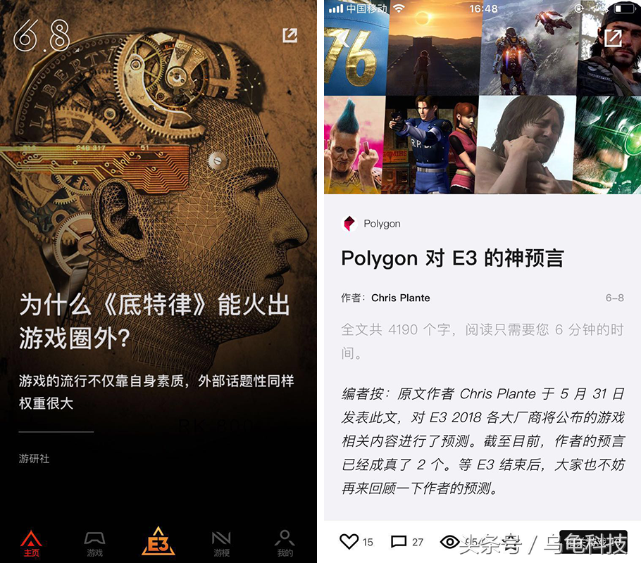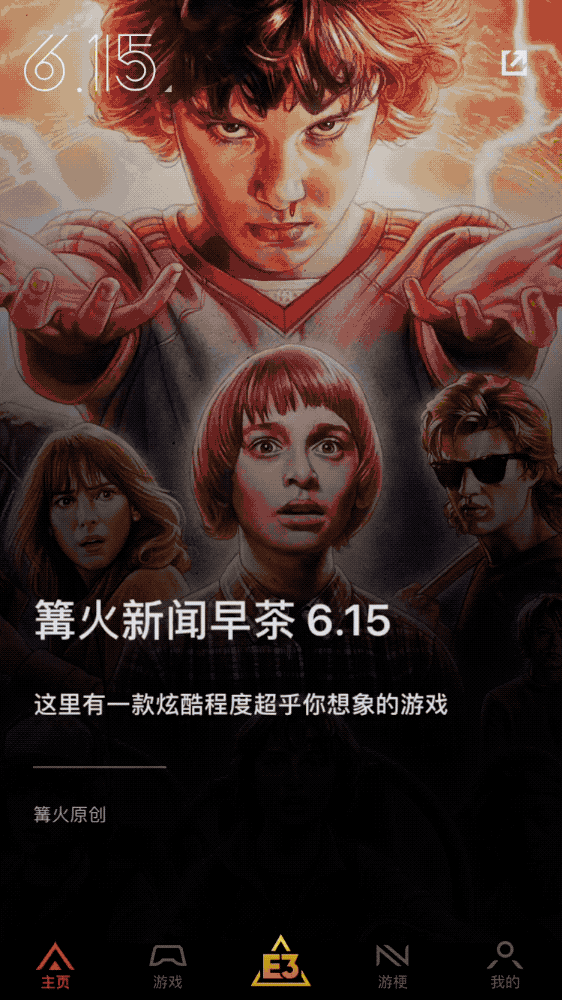 篝火营地是趁着 E3 的热度推出的,现在平台上的很多资讯也是聚焦在 E3。App 的主页栏中都是关于游戏的报道,除了篝火的原创,还有很多优秀的游戏媒体入驻,比如游研社、机核等,所以在内容质量上控制得十分不错。