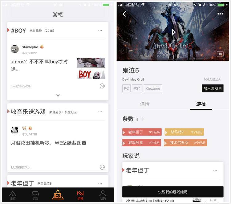 除了游戏媒体写的内容报道,篝火营地中还给玩家提供了交流的地方,就是「游梗」。每个游戏的主页都有玩家记录下自己的游戏经历,关注你感兴趣的游戏,就可以在「游梗」这一栏中看到相关的玩家经历,并参与讨论。这些评论的分类很有意思,除了集中在一个游戏之外,还可以针对一个固定的「梗」,比如《鬼泣 5》中的「老年但丁」,就是一个只有关注者才会注意到的「梗」。这种可以让玩家会心一笑的讨论其实非常适合活跃社区氛围。