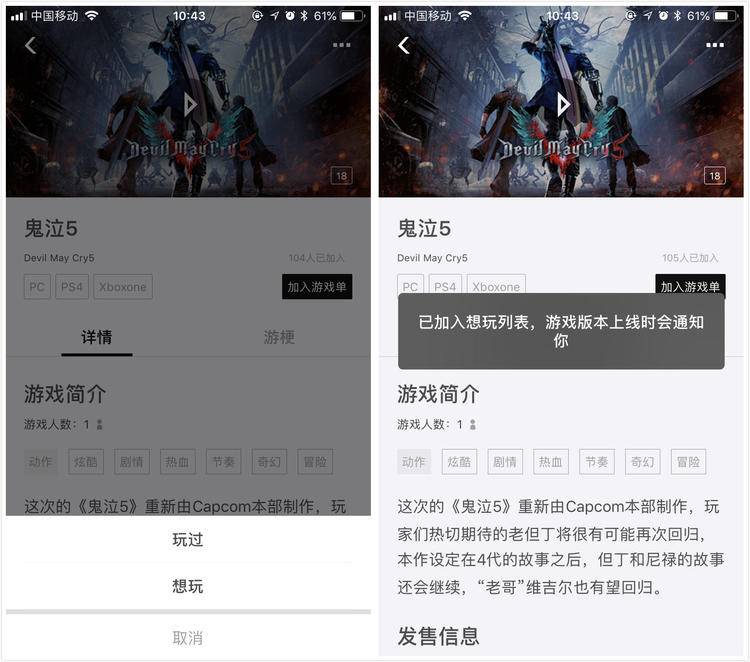 当然,资讯和社区属性只是篝火营地的一部分,让我最喜欢的是它的游戏库。就像前面说的,篝火营地里的游戏库十分丰富,最难得的是不局限于一个平台,你喜欢的《绝地求生》、《王者荣耀》、《鬼泣》在这里都可以找到。游戏主页有关于游戏的简介、评分、平台、开发商等信息,感兴趣的可以加入游戏单,有「玩过」和「想玩」两个选项,最厉害的来了——如果关注了尚未发售的游戏,等游戏上线时会给你通知提醒。这可比即刻上的主题要全,也更及时,同时也比你天天刷游戏媒体、关注游戏官微效率更高。