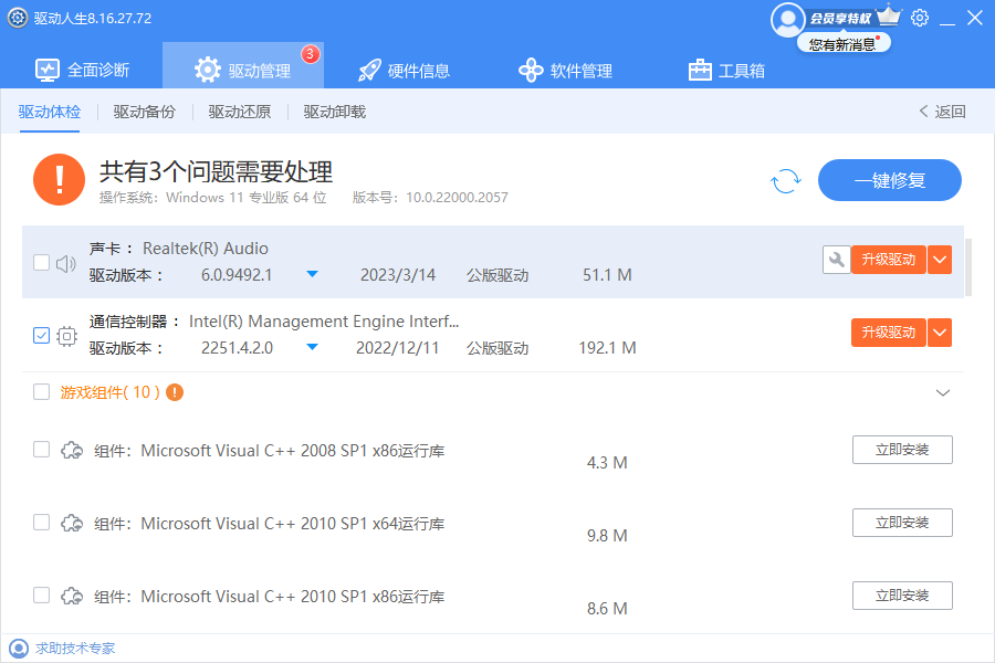 步骤三:在驱动人生8-驱动管理 中,找到“声卡”点击“升级驱动”或直接点击“一键修复”,驱动人生8 将对问题声卡驱动进行自动修复。