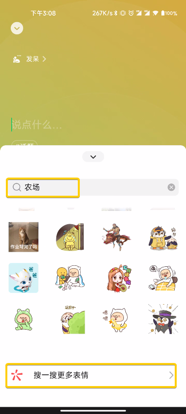 我们输入“农场”进行搜索,不用管当前搜索结果,直接拉到底部点击【搜一搜更多表情】。