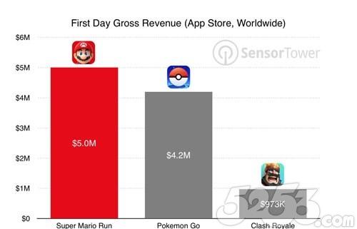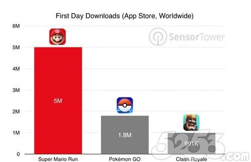 据应用市场研究公司Sensor Tower的数据显示,《超级马里奥跑酷(Super Mario Run)》在游戏上线一天的时间内,成功拿下了超过500万次的下载量,远超今年另外两款爆火大作《精灵宝可梦GO(Pokemon Go)》与《部落冲突:皇室战争(Clash Royale)》,而首日获得的收益,也是这三款作品中最高的。