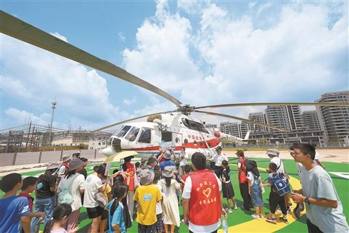 8月22日,湘江航空应急救援科普体验中心,学生参观体验直升机。湖南日报全媒体记者 辜鹏博通讯员 黄阳 摄影报道