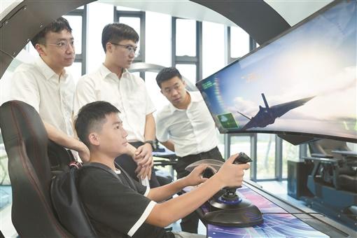 8月22日,湘江航空应急救援科普体验中心,学生体验模拟驾驶战斗机。