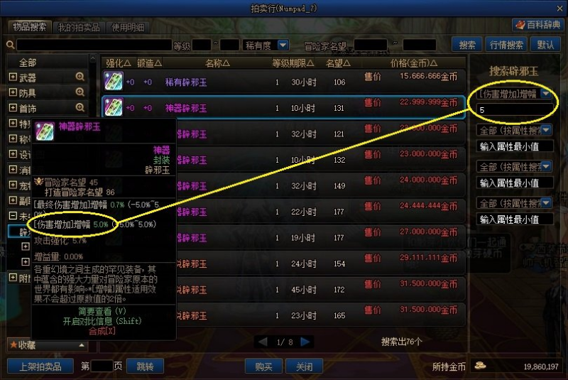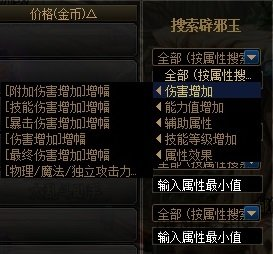 拍卖行中辟邪玉搜索时,不建议选太多词条,容易搜不到通常情况下可选择1个主词条,然后在搜索结果中逐一筛选,因为理想中的完美辟邪玉基本不会上架拍卖行,会有“其他安排”;选好搜索属性,输入数值不超过该词条上限,基本都会有结果: