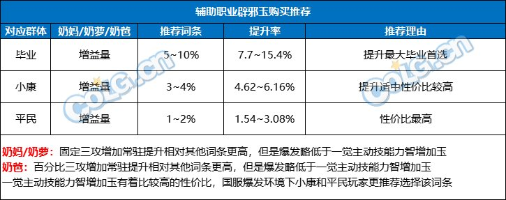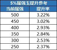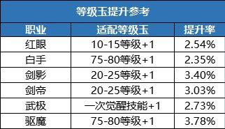 攻击强化玉会随着特色的提高,提升率下降,但是总体比例还是在1:3左右,对于特色不够齐全的小号,可以选择攻击强化玉会有更高的性价比。以5%攻击强化辟邪玉为例,3技攻玉提升为5.68作为基准,提升率对比参考