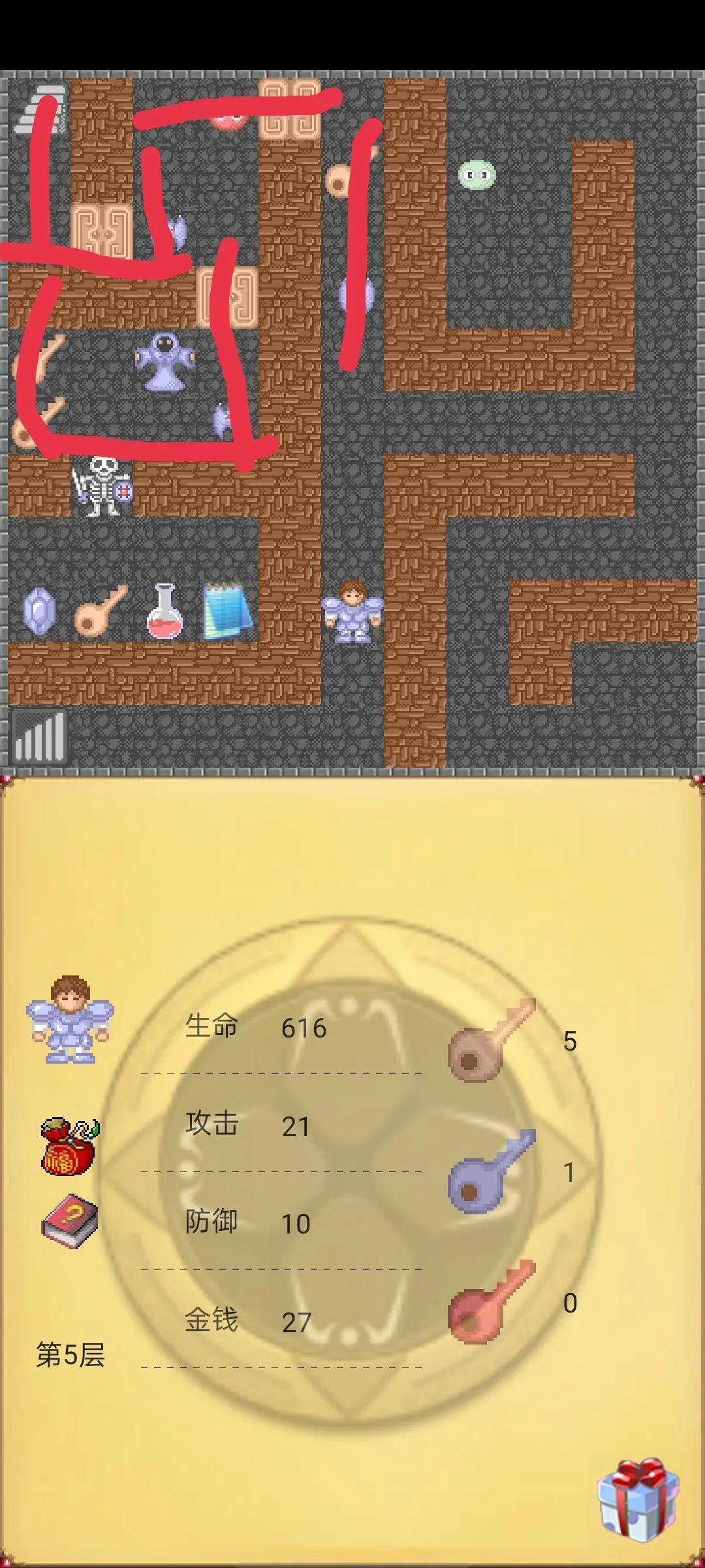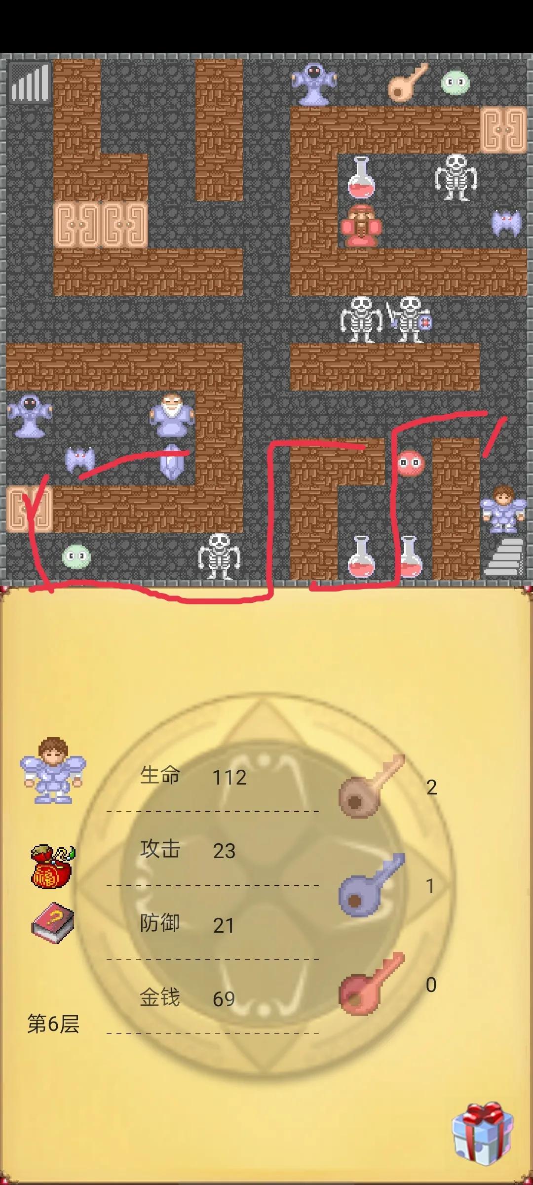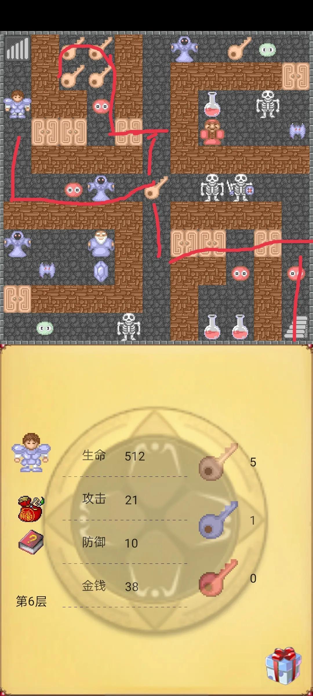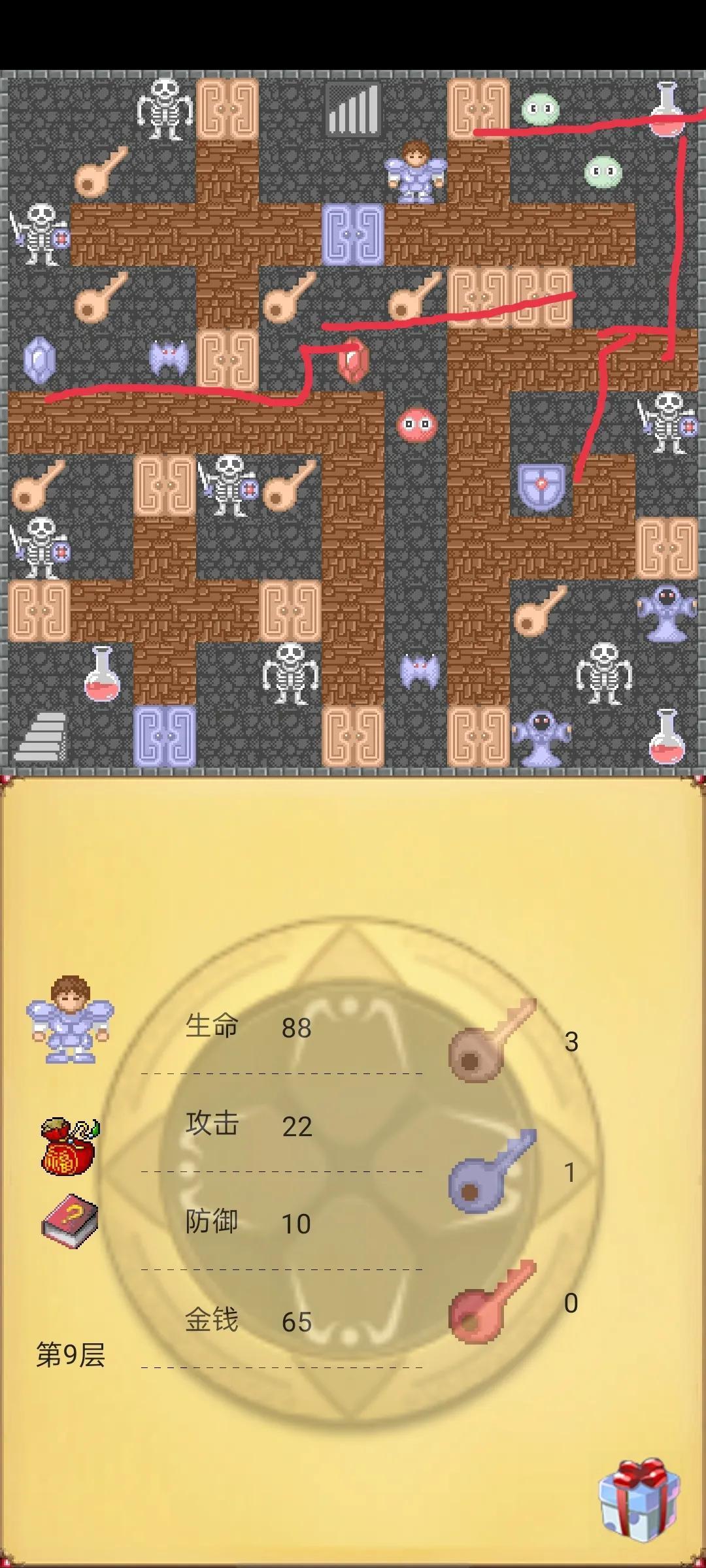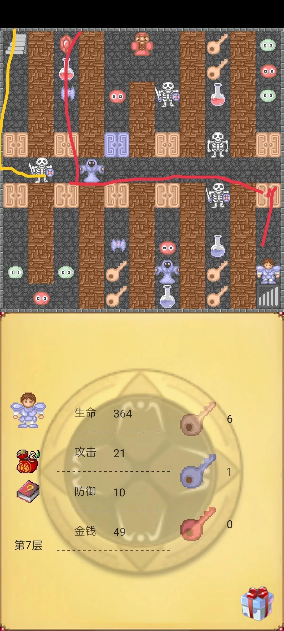 第四步回到第5层按下图路线走,在去第6层也按下图路线走,在去第7层这个注意我图中有两种颜色路线先红色在黄线,在去第8层按下图路线开3黄门获得3钥匙,在上第9层,按下图路线先走暗道获得铁盾在攻击石头,在开黄门击杀蝙蝠获得防御石头,到这没错的话应该是攻击23 防御21。