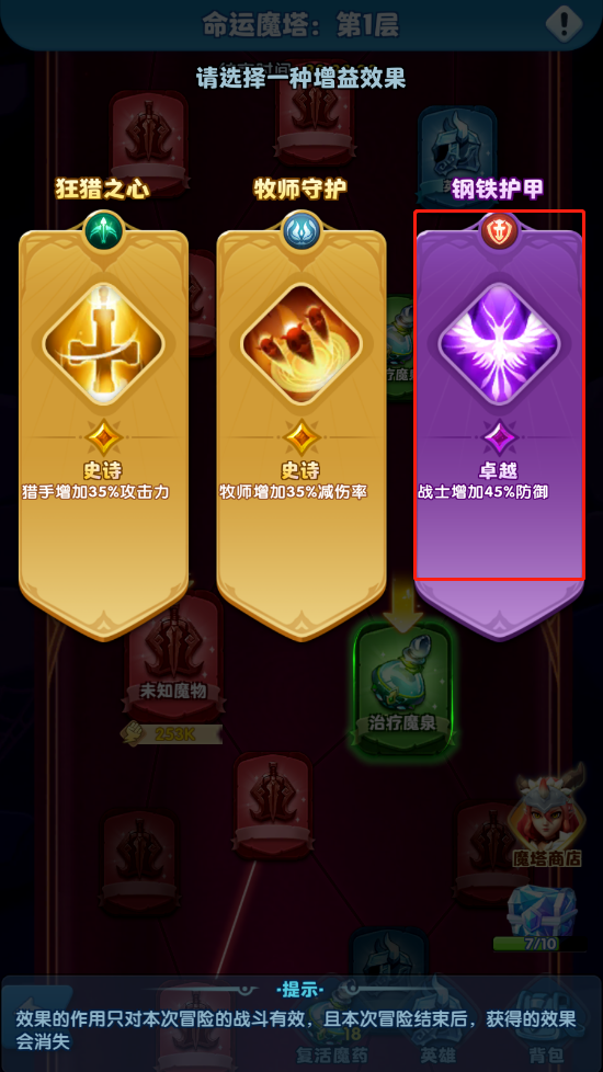 英雄的优先级是最高的,优先考虑英雄的格子。在挑选英雄的时候我们可以根据自身情况挑选,比方说我现在的队伍前排血量不太够了,距离恢复格子还有很远,那我就可以考虑拿一张前排的卡。