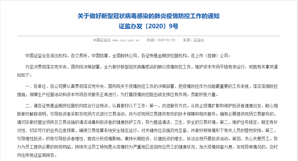 1月28日,证监会在官网发布《关于做好新型冠状病毒感染的肺炎疫情防控工作的通知》,明确各证券基金期货经营机构结合行业特点,改进服务方式。从防止疫情扩散和保护投资者健康出发,耐心细致做好解释说明,引导投资者采取非现场方式进行交易活动,并为非现场交易提供有效的技术保障和相关服务;确有必要提供现场交易服务的,请切实做好营业场所及交易设施的清洁消毒和投资者的健康防护工作,努力营造清洁、卫生、安全的交易环境。