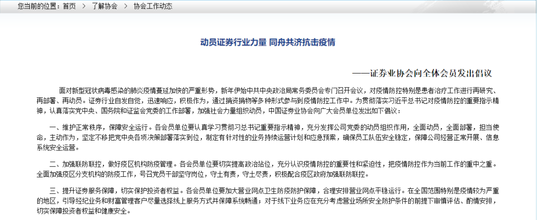 1月27日,中证协也在官网向广大会员单位发出六大倡议,并号召各会员单位要加大营业网点卫生防疫防护保障,合理安排营业网点平稳运行。在全国范围特别是疫情较为严重的地区,引导经纪业务和财富管理客户尽量选择线上服务方式并保障系统畅通;对于线下业务应在充分考虑营业场所安全防护条件的前提下审慎评估、酌情安排,切实保障投资者权益和健康安全。