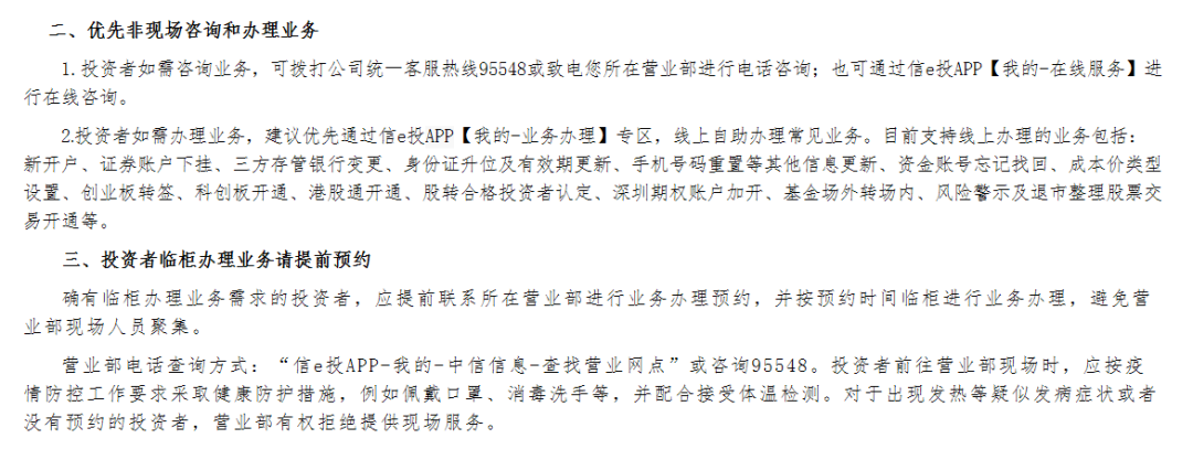 以中信证券为例,公司在官网表示,优先非现场咨询和办理业务。投资者如需咨询业务,可拨打公司统一客服热线95548或致电所在营业部进行电话咨询;也可通过信e投APP【我的-在线服务】进行在线咨询。
