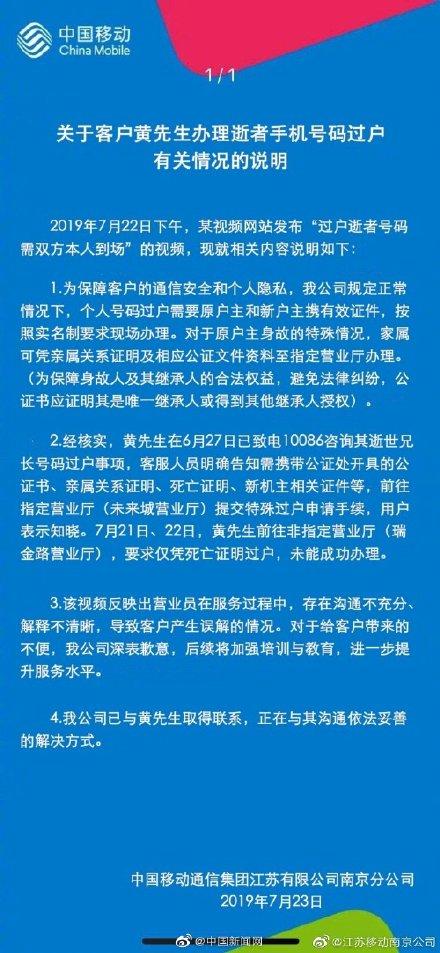 【江苏移动:当事人未到指定营业厅办理】针对“过户逝者号码需双方本人到场”一事,江苏移动南京公司23日回应称,黄先生在6月27日致电10086咨询其逝世兄长号码过户事项,客服人员已明确告知需携带公证处开具的公证书、亲属关系证明、死亡证明、新机主相关证件等,前往指定营业厅提交特殊过户申请手续,用户表示知晓。7月21日、22日,黄先生前往非指定营业厅,要求仅凭死亡证明过户,故未能成功办理。(谢艺观)